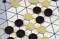 En este momento ambos jugadores han hecho un movimiento. Cuando se pone en juego una nueva ficha, puede colocarse en un punto vacío o en un punto ya ocupado. Si el punto ya está ocupado, primero debe ser desalojado: la pieza que ocupa ese juego, independientemente de su color, debe ser movida al punto más cercano. Si este punto también está ocupado, el peón que lo ocupa también debe moverse un punto, y así sucesivamente... Entonces, el peón inicial se coloca en el punto desocupado.