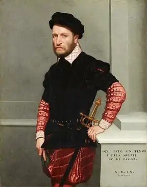 El mismo año de su nombramiento como Virrey de Navarra, en 1560, encargó al pintor el único retrato suyo que se conserva.[1] Moroni estaba acostumbrado a pintar nobles, pero de una escala inferior que su nuevo cliente, pero en un alarde de profesionalidad pintó uno de sus mejores cuadros, en el que muestra a un noble de etiqueta sobre fondo clásico, satisfecho de su trayectoria y muy seguro de sí mismo, como lo demuestra el lema que aparece escrito sobre el pedestal en el que se apoya: Aquí estoy sin temor y de la muerte no he pavor.