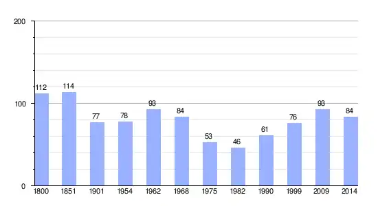 Los datos demográficos contemplados en este gráfico de la comuna de Gadancourt[4]se han cogido de 1800 a 1999 de la página francesa EHESS/Cassini, y los demás datos de la página del INSEE.[5]