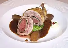 La galantina es un fiambre francés compuesto por carne deshuesada rellena, comúnmente de ave o pescado, que se cuece a fuego lento y se sirve fría, cubierta con aspic. Las galantinas se rellenan a menudo con farsa, y se prensan para darles forma cilíndrica. Debido a que deshuesar aves se considera difícil y laborioso, este plato se considera bastante elaborado, por lo que a menudo se decora profusamente, de donde procede su nombre. A finales del siglo XIX la técnica ya había sido atribuida al chef del marqués de Brancas,[1]