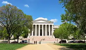 El museo se compone de dos edificios unidos por un pasaje subterráneo. El edificio original, que actualmente se conoce como edificio oeste, se abrió el 17 de marzo de 1941. Fue considerado el mayor de su época construido en mármol. Es de diseño neoclásico, con un pórtico con columnas y una cúpula que recuerdan el Panteón de Agripa. También tiene unas alas simétricas a ambos lados de la cúpula. El proyecto es de John Rusell Pope, cuya otra gran obra en Washington también incluye una cúpula, el Monumento a Jefferson.