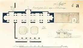 Se trataba de un espacio rectangular, de unos 30 metros de anchura y más de 7 metros de alto, de planta biabsidial y cubierto con tejados de pizarra. Estaba integrado por cinco tramos abovedados, que se organizaban estructuralmente con un sistema de soportes propio. Los dos laterales se sujetaban con pilares, mientras que los tres intermedios descansaban sobre columnas[1] de orden toscano.