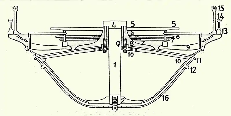 Un golpe colocadas todas las cuadernas sobre la quilla o carena, se reforzaba el conjunto con la sobrequilla. Se unían los cabos superiores de las cuadernas con un trancanil longitudinal a cada banda y se montaban los baos, largueros de parte a parte.[18]