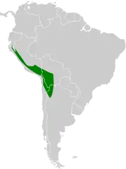 Se encuentra en Perú, Bolivia, el norte de Argentina y Chile y el extremo sur de Ecuador.[1] Sus hábitats naturales son los humedales y planicies de montaña.[4]