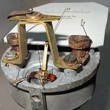 Un galvanómetro es un instrumento que se usa para detectar y medir la corriente eléctrica.[1] Se trata de un transductor analógico electromecánico que produce una deformación de rotación en una aguja o puntero en respuesta a la corriente eléctrica que fluye a través de su bobina.[2] Este término se ha ampliado para incluir los usos del mismo dispositivo en equipos de grabación, posicionamiento y servomecanismos.