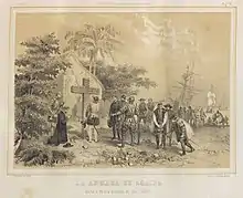 «La armada de Loaisa arriba a la isla desierta de San Mateo». Litografía de Vicente Urrabieta en ''Historia de la Marina Real Española'' (1849-1854)