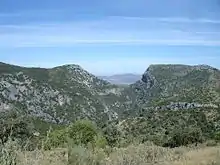 Tras recorrer aproximadamente 1,5 km desde que abandonamos la carretera, remontaremos una pequeña cuesta para doblar hacia la izquierda e iniciar el descenso hasta la Garganta por un camino que serpea su ladera. Desde los primeros momentos la vegetación cambia con respecto al tramo anterior y a orillas del camino se instala un tupido matorral, allí donde el suelo lo permite. En él destaca la presencia de la sabina, cupresácea fácilmente indentificable por sus pequeñas bayas de color marrón oscuro. Junta a las sabinas no faltan tampoco retamas y matagallos, lentiscos o cornicabras. La especie arbórea más abundante es aquí el algarrobo, que actúa casi como rupícola viéndose obligado a crecer en las oquedades donde se acumula algo de suelo o entre las mismas fisuras de las rocas calizas. El acebuche, también abundante nos acompaña en nuestro suave descenso - todavía-. En esta ladera más expuesta al sol que la opuesta, encontraremos junto a las especies citadas otras de carácter más termófilo como el palmito, la zarzaparilla, olorosos tomillos, o el espigo negro conocido también como cambronera, arbusto del que se afirma toma el nombre el cercano monte de Cambronera, por cuya falda caminamos. Estas especies, que denotan influencias del piso termomediterráneo, se ven acompañadas a lo largo de todo el camino de descenso por otras propias de terrenos secos, soleados y abiertos. Encontramos ahí distintas especies de leguminosas como la inconfundible Psoralea bituminosa o trébol hediondo (fácilmente reconocible por su olor), la alacranera (Coronilla scorpioides), la hierba de plata. El camino continúa su descenso hacia la garganta y frente a nosotros veremos las estribaciones de la S.ª de Zafalgar. Al poco pasamos bajo una cornisa formada en la pared que casi techa la vereda, y bien pudieran ser los techos de cavidades hundidas. A partir de este lugar el sendero se estrecha e inicia su descenso en zigzag por la ladera con rápidas pendientes, abriéndose paso entre las rocas. En estas paredes rocosas el matorral incluye las mismas especies que en zonas más altas pero se presenta mucho más aclarado. En un punto de la vereda de descenso, ésta atraviesa una gran roca entre la que se han tallado escalones.