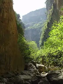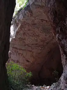 Tras algo más de 1,30 h desde que salimos de la carretera, llegamos al lecho del río. Salvo la época de lluvia suele estar seco, pese a lo cual nos invade un frescor inusitado aún en los meses más calurosos del estío, cuando las diferencias térmicas entre la parte superior de la pared y la gruta que luego visitaremos puede llegar a ser más de 10 °C. Las altas y verticales paredes, separadas en algunos lugares por tan sólo 10 m, proyectan sobre el cañón una permanente sombra que lo mantiene fresco y húmedo. Si a esto añadimos, que aún en los meses de verano rezuma el agua por multitud de grietas y fisuras, comprenderemos cómo la vegetación que en estos lugares se desarrolla debe forzosamente contrastar con la que crecía sobre las paredes, expuestas al sol.
