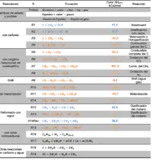 Las ecuaciones que se llevan a cabo en el proceso de gasificación de la biomasa, cuando se utiliza aire como agente gasificante, clasificadas según las reacciones con C, O2, H2O, producción de CH4 y reformado con vapor se muestran en la tabla.