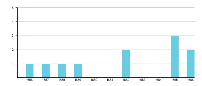 La realidad es que en los cinco años que van desde 1660 hasta 1664 únicamente se registra un trabajo (1662), mientras que en los dos últimos se concentra la mitad de la producción, ya que se imprimen cinco títulos.