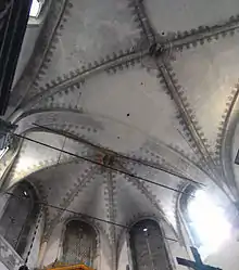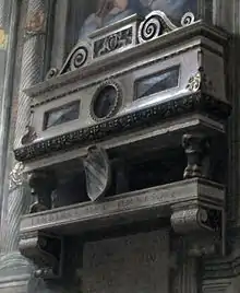 Nótese que el contrato final con delle Croci fue en 1516 [note 14] mientras que Cairano murió en 1517: [67] si Cairano efectivamente trabajó en el monumento, se puede deducir de los documentos que no habría tenido tiempo suficiente para terminarlo completamente dentro del plazo, y en consecuencia una gran parte del mismo debía haber sido hecho antes de esta fecha. [note 15] Esto significa admitir la participación de Cairano antes de 1516, lo que no está atestiguado en los documentos. [note 16] [68] En efecto, el mismo contrato de 1516 afirma que la obra estaba incompleta cuando se instaló en la iglesia; se desconoce cuál era su estado en ese momento; y los restos de Bernardino Martinengo ya estaban alojados en él desde el año anterior. La implicación es que el progreso del monumento pudo haber estado casi terminado, al menos en la estructura y los componentes arquitectónicos. [69] El carácter incompleto al que aluden los documentos de 1516 se refiere probablemente a los insertos decorativos de diversa índole, incluidos los bronces que se deben definitivamente a della Croci [70]