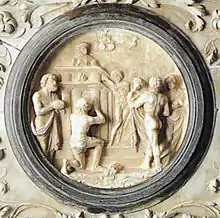 Un minucioso análisis estilístico de la ornamentación del monumento, en particular de las figuras dentro de los círculos de la Escena de la Batalla y la Escena del Sacrificio, revela una sorprendente sensibilidad por el bronce por parte de Cairano, y un amplio margen para la reinterpretación y la mezcla de estilos. [71] Esto surgió de una respuesta sensata al contexto en el que se diseñó e implementó el mausoleo. Sin precedentes en Brescia fue la combinación de bronce y piedra, el primero bajo la supervisión de Bernardino delle Croci, quien ciertamente tenía un vasto catálogo de referencias a obras antiguas y contemporáneas, todas las cuales se citan en las rondas mayores y menores en la base. [72] [73]Es difícil excluir a Cairano de la influencia de tanto clasicismo, pero la única Escena del sacrificio atestigua la sofisticación de su cincel y la innovadora combinación de escultura y bronces en torno a 1510, fecha a la que también puede adscribirse gran parte del aparato lapidario restante. [71]