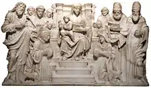 Consideraciones estilísticas sitúan a mediados de la segunda década del siglo XVI una serie de obras, generalmente pequeñas estatuas, relieves o fragmentos sacados de su contexto original y dispersos en diferentes lugares. [74] Aún no está claro si estos artefactos se debieron a Cairano o al resultado inmediato de sus colaboradores, por ejemplo, su hijo Simone. [53] Se trata de obras en las que se desdibuja el límite entre la madurez del arte de Cairano y el trabajo de taller, y el discernimiento depende de un análisis del desarrollo de Cairano desde sus obras más tempranas, como el Santuario de los Milagros y la Logia, [note 17] combinado con claros intentos de actualización cultural. [53] Es el caso, por ejemplo, de la Lamentación sobre Cristo muerto de Cairano conservada en el Museo de Arte Antiguo de Milán, [75] y del Descendimiento de la cruz en el Museo de Santa Giulia de Brescia, [76] que parecen señalar modelos pictóricos de Giovanni Bellini y Girolamo Romani . [76] Otra obra destacada, fechada en la primera década del siglo, es la denominada Pala Kress de la National Gallery of Art de Washington, DC [77]