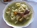 - El minestrone, una sopa ligure a base de legumbres frescas y tomate, se transformó en menestrón,[1] una sopa contundente con carne de ternera, diversas pastas cortas, habas, papas, queso fresco, albahaca, yuca y frijoles frescos.