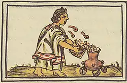 El maíz era el alimento básico más importante de los aztecas. Se consumía en cada comida por todas las clases sociales, y desempeñaba un papel central en la mitología azteca. Para algunos de los primeros europeos que llegaron a América, los aztecas solían describir al maíz como algo «precioso, nuestra carne, nuestros huesos».[11] Existía, y aún existe en un gran número de variedades de diversos tamaños, formas y colores; amarillo, rojizo, de color blanco con rayas de color negro, e incluso una variedad azulosa que se consideraba particularmente valiosa. Innumerables variedades locales y regionales existían en toda Mesoamérica, pero pocas de estas se registraron. El maíz fue reverenciado hasta tal punto que las mujeres soplaban sobre el maíz antes de cocerlo de modo que este no temiera el fuego, y ningún maíz que fue dejado caer sobre la tierra era desperdiciado. Uno de los historiadores de los aztecas fue el misionero español franciscano y cronista Bernardino de Sahagún quién explicó la práctica de la siguiente manera: