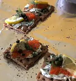 - Gravlax o Graved Laks, es un aperitivo que consiste en finas rodajas de salmón curadas en sal, azúcar y eneldo servido sobre pan crujiente, decorado con pimienta negra y limón.