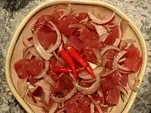 - Salmón lomi-lomi: salmón en dados combinado con tomate, cebolla Maui y guindilla.