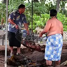 Antes de cocinarlos, los cerdos y perros se sacrificaban estrangulándolos o asfixiándolos, para conservar su sangre.[10] La carne se preparaba aplanando el animal destripado entero y asándolo sobre carbones, o espetado.[10] Los animales mayores, como gallos, cerdos y perros, se cocinaban típicamente en hornos de tierra, o espetados sobre el fuego durante banquetes ceremoniales.[11][10] Los hornos de tierra hawaianos, llamados imu, combinan el asado y la cocción al vapor en un método llamado kālua. Se cava un hoyo en la tierra y se forra con rocas volcánicas y otras que no se rompan cuando se calienten a altas temperaturas, como el granito.[12] Se hace fuego con brasas, y cuando las rocas estén al rojo se retiran estas y se introducen los alimentos envueltos en hojas de ti, jengibre o plátano, se cubre con hojas húmedas, esteras y una capa de tierra. Puede añadirse agua a través de un tubo de bambú para producir vapor. El intenso calor de las piedras calientes cocina la comida perfectamente, pudiendo cocinarse comida para varios días de una sola vez, sacándose y consumiéndose lo que se necesita, cambiándose la cubierta para mantener el resto caliente.[7] Las batatas, el taro, el árbol del pan y otras verduras se cocinaban en el imu, así como pescado. Los congrios se salaban y secaban antes de hacerse en el imu.[13] Los pollos, cerdos y perros se ponían en el imu con rocas calientes en la cavidad abdominal.[7] Los hombres realizaban todo el proceso, y la comida para las mujeres se hacía en un imu separado (hombres y mujeres tomaban sus comidas por separado). La antigua costumbre de cocinar con el imu sigue conservándose.[14]
