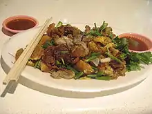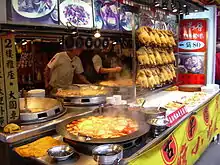 - Ô-á-chian (蚵仔煎, kézǎi jiān) — tortilla de ostra hecha con huevo, ostras, almidón de tapioca y hojas de mojigata. Tiene una textura blanda y pegajosa, y se como con una salsa dulce y ligeramente picante, cubierta con cilantro. Es un plato muy común en los mercados nocturnos, al tratarse del aperitivo más popular de Taiwán.[1]