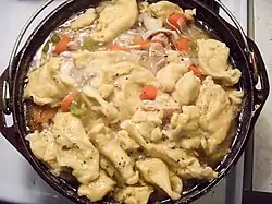 - Pot pie, un estofado de carne con fideos grandes (plazas de pastel del tarro); a menudo presenta pollo, harina, sal, vegetales (como apio, cebolla, y zanahorias) así como especias (como perejil, tomillo, pimienta negra, y laurel).