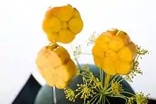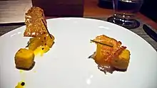 - Acompañamientos aromáticos como gases embolsados, dispositivos para servir, o la comida en sí misma. Una sustancia aromática presentada como adorno,[25] emplatado creativo[26] o un olor producido por la combustión de un ingrediente.