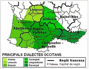 Las principales zonas de producción en Occitania son la costa del Languedoc, las laderas del Ródano y alrededor de Burdeos. Así destacan los vinos tintos de Burdeos y de la Sierra de la Corbera, los blancos secos espumosos de Die y Valença, los blancos dulces espumosos como la blanquette de Limoux,[37] y los rosados del Ródano y de la Provenza en general. El vino rosado, en occitano, se dice que es gris,[38] ya que no es ni vino blanco ni vino tinto (el vino tinto, en occitano, y en catalán, se dice que es negro).