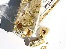 El nougat, en occitano: nogat (de pan nogat, pan con nueces),[36]es un tipo de dulce de consistencia mucho más blanda que el turrón, aunque no tanto como el halva, hecho con huevo, miel y frutos secos, como por ejemplo, almendra o pistacho u otros. Existe uno con denominación de origen, producido en la villa occitana de Montélimar y otro en Limoux, existen otras variantes, que aunque a veces se llaman tourón, no son turrones sino nogats, en las zonas de Occitania cercanas a Cataluña y recientemente también en otras zonas más lejanas, como por ejemplo el Lemosín.