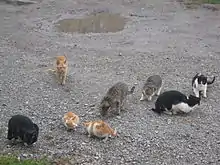 Los gatos cimarrones a menudo viven en grupos llamados colonias, que se encuentran cerca de las fuentes de alimentos y el refugio.[8] Los investigadores no están de acuerdo sobre la existencia, el alcance y la estructura de las jerarquías de dominación entre los gatos cimarrones en las colonias.[35][38] Se han observado diferentes tipos de jerarquías en las colonias, incluidas las jerarquías despóticas y lineales. Algunas colonias se organizan en estructuras más complejas, como jerarquías relativas, donde el estado social de los gatos individuales varía, dependiendo de la ubicación, la hora del día o la actividad en la que se dedican los gatos, en particular la alimentación y el apareamiento.[39][40]