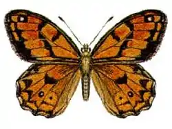 Los adultos tienen alas anaranjadas con venas y manchas marrones. Tienen un ocelo en cada ala anterior, y un ocelo vestigial en cada ala posterior. Su envergadura es de aproximadamente 3,5 cm.[2]