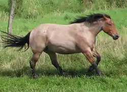 Un caballo negro, que lo lleva, tiene crines de color crema y una capa marrón oscura chocolate. A veces parecen como caballos alazanes oscuros, pero genéticamente son completamente diferente.