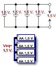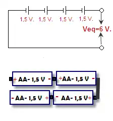 Veq = V1 + V2 + V3 + V4 = 1,5 V + 1,5 V + 1,5 V + 1,5 V = 6,0 V |