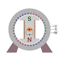 En las máquinas actuales, se coloca un dispositivo interior giratorio conformado por un núcleo magnético y un conductor dispuesto en forma de espiras llamado rotor (inductor), y una parte externa fija denominado estator (inducido). Al rotor se le suministra una corriente continua para su excitación, la que genera un campo magnético.