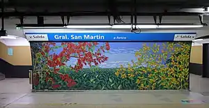 La estación General San Martín no poseía originalmente los murales cerámicos característicos de la línea C, que le dieron en los años 1930 el mote de «línea de los españoles», debido a su inauguración tardía. Fue recién en 1969 que la concesionaria pública SBA la dotó de una serie de 8 murales hechos en cemento policromado por el artista plástico Rodolfo Medina. El tema común fue La gesta sanmartiniana, expresada conceptualmente e incluso de forma abstracta en algunos casos: de la esclavitud inicial surge la chispa de la Libertad que emerge como un Sol (mural 3), se da el Grito de la Libertad y la voz se corre (mural 4). El mural 5 recuerda la donación de joyas, su fundición y la confección de banderas por parte de las damas mendocinas, y el 6 recuerda las grandes batallas libradas por la independencia de Chile. El mural 7 representa el triunfo final mediante un Sol victorioso, el abrazo de Guayaquil, y el amor y reconocimiento hacia el Libertador, mientras que el 8 cierra el ciclo con el homenaje final con clarines, palomas que emprenden vuelo, una madre con su niño en brazos y los cañones que ya no disparan.[2][3]