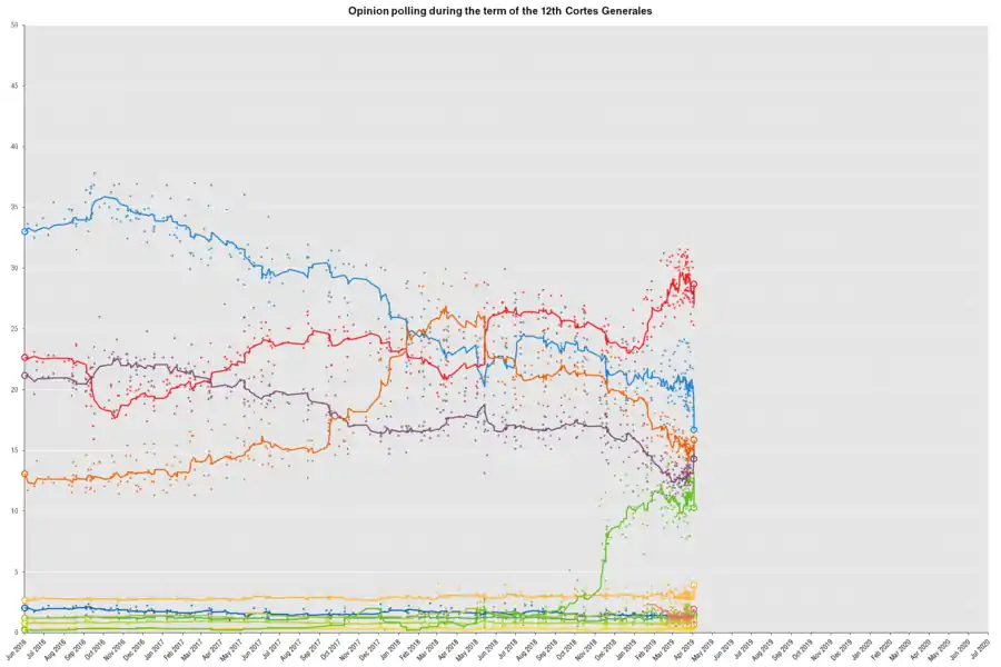 El 13 de febrero de 2019 el Congreso de los Diputados rechazó el presupuesto propuesto para 2019, por lo que Sánchez convocó a elecciones anticipadas para abril, y la fecha específica se anunció tras una reunión del Consejo de Ministros el 15 de febrero.[4][5][6] Se realizaron finalmente el 28 de abril junto con las elecciones valencianas, y a un mes de las elecciones europeas, autonómicas y municipales del 26 de mayo.