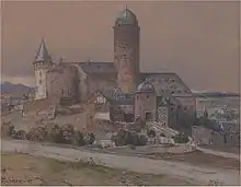 El complejo de planta heptagonal irregular, conocida como Oberburg estaba protegido antiguamente del lado de la ciudad por un foso, un zwinger y un bergfried. A lo largo del foso pasa actualmente una calle principal. El foso era salvado por un puente arcado, en piedra, de 20 metros de longitud.[3]