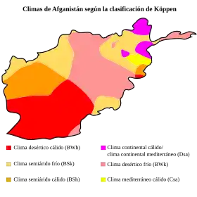 Afganistán, atravesado por el Hindu Kush y por el Pamir en el extremo nordeste, cerca de la frontera con China, posee estrechos valles y elevados picos que superan los 7000 m. En los altos valles hay ciudades como Bamiyán, a 2500 m, en el centro-este, en la Ruta de la Seda, con un clima frío, medias en enero de -10 y 1.oC, y en verano de 10 y 26.oC, con una escasa precipitación invernal y primaveral de 117 mm.[2]