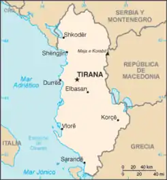 La capital es Tirana, con 616 396 habitantes (2008). Las ciudades principales son: Shkodër o Shködra (Escútari), Durrës (Durazzo, Dirraquio), Valona, Korce y Elbasan. El país se divide en doce condados (qarqe, en singular, qark): Berat, Dibër, Durrës, Elbasan, Fier, Gjirokastër, Korçë, Kukës, Lezhë, Shkodër, Tirana y Vlorë.