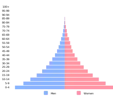 La población estimada de Angola en 2021 era de 34 a 35,5 millones de habitantes, con una media de edad de poco más de 16 años (en España es de 44 años), casi la mitad de la población (48 %) con menos de 14 años y un incremento anual del 3,3 %, un primer hijo a la 19-20 años y una media de 6 hijos por mujer, con una esperanza de vida de 62,2 años.[12][13]
