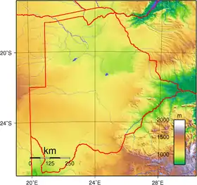 El punto más bajo de Botsuana es el lugar de unión de los ríos Limpopo y Shashe, a 513 mm, en la frontera con Zimbabue y Sudáfrica. El punto más alto es el monte Monalanong, a 1.494 m, en una zona de altiplanos cubierta de bosque, en el sudeste, cerca de Gaborone. Otros puntos igualmente altos son la mole de granito de cercano cerro Otse, de 1.491 m, al sur del anterior, junto a la ciudad de Otse, y, en el otro extremo del país, las colinas de Tsodilo,[4] al noroeste, un grupo de rocas que se elevan sobre la planicie al oeste del delta del Okavango, hasta los 1.400 m, y que los bosquimanos consideran lugar sagrado.[5]