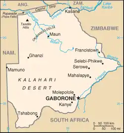 Botsuana limita al norte con Zambia, al este con Zimbabue, al sur con Sudáfrica y al oeste y al norte con Namibia. El país está dominado en gran medida por el desierto del Kalahari, el desierto más meridional de África, que domina en especial el norte y el oeste del país.[1]
