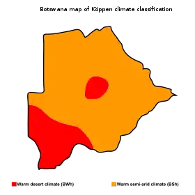 El clima de Botsuana es semiárido, debido a la cortedad de la estación de las lluvias. Sin embargo, la relativa altitud del país, una media de 1000 m, y su situación continental le dan un clima subtropical. Está demasiado lejos de las masas de aire húmedo la mayor parte del año. La estación seca dura de abril a octubre en el sur y hasta noviembre en el norte. El invierno dura de mayo a agosto, y es seco y soleado.