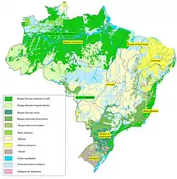 En general, el país se divide en llanuras, mesetas y depresiones. Las mesetas o planaltos pueden ser de rocas cristalinas muy antiguas o sedimentarias de los periodos Cenozoico y Mesozoico.[3] Las mesetas de materiales sedimentarios, caracterizadas por la presencia de cuestas, se encuentran en la cuenca amazónica oriental y occidental, en la cuenca del río Parnaíba y en la subcuenca del río Paraná. Las mesetas en áreas cristalinas se caracterizan por la presencia de colinas y sierras asociados a intrusiones volcánicas y plegamientos antiguos. Entre estas unidades se encuentran los del norte de la Amazonia (Escudo guayanés), los del sur de la Amazonia y en la Chapada dos Parecis, al sudeste de Mato Grosso. La meseta de Borborema y las Serras de Sudeste proceden de la elevación de plegamientos antiguos. En el centro y sudeste, se encuentran grandes áreas elevadas en los cinturones orogénicos, caracterizadas por cadenas montañosas. Este conjunto constituye la llamada meseta brasileña, que ocupa una gran extensión en el centro del país y cuyas principales cadenas son la sierra de Mantiqueira, la sierra del Mar, la Serra do Espinhaço y la sierra Geral.