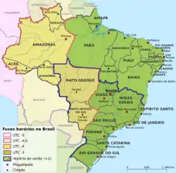 El territorio brasileño, incluidas las islas oceánicas, posee cuatro husos horarios, todos al oeste del meridiano de Greenwich (longitud 0.o). En cada franja de 15.o entre meridianos se produce una variación de 1 hora. Esto significa que en Brasil, el horario oficial varía de 2 a 5 horas menos en relación con el Tiempo universal coordinado, UTC, que regula los relojes y el tiempo. La primera franja engloba las islas oceánicas (longitud 30.o W), con dos horas menos que en UTC, sincronizado con el Tiempo medio de Greenwich u hora Zulú. La segunda franja (45.o W) tiene 3 horas menos que UTC y es la hora oficial de Brasil (horario de Brasilia) y engloba los estados de Distrito Federal, Pará, Amapá, Tocantins, Goiás y las regiones Sur, Sudeste y Nordeste; el tercero (60.o W), con cuatro horas menos, incluye Mato Grosso do Sul, Mato Grosso, Roraima, Rondônia y gran parte del estado de Amazonas, y la cuarta y última franja (UTC-5) engloba los estados de Acre y una pequeña parte del estado de Amazonas.[1]