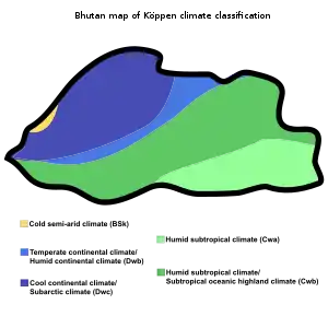 El clima varía del subtropical en la planicie de Duars, al templado, de inviernos fríos y veranos cálidos, en los valles de las montañas centrales. En el Himalaya los inviernos son severos y los veranos frescos. Se vuelve más inclemente a medida que se asciende a las mayores elevaciones. Como la mayoría de los países asiáticos está afectado por el monzón. Este se ve afectado primero en verano por el monzón del Suroeste, que trae mucha humedad. Durante parte del otoño se prolonga este monzón en parte. El monzón de invierno procedente del suroeste, trae fuertes ventiscas, las nevadas son comunes hasta en alturas de 3.000 m y se producen fuertes tormentas. La precipitación media anual por lo general es alta: oscila entre 1.520 mm en los valles de las montañas y 5.080 mm en la llanura del Sur.[6]