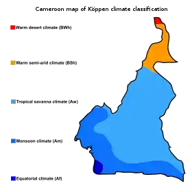 En Camerún, el clima es tropical, semiárido en el norte y húmedo y lluvioso en el resto del país, con una zona ecuatorial cerca de la costa. En prácticamente todo el país, hay una estación seca en invierno y una húmeda en verano debido al monzón, corto en el norte y largo en el sur. A lo largo de la costa se producen chaparrones todo el año. A orillas del lago Chad caen menos de 600 mm anuales, mientras que en la costa se superan los 3000 mm.[1]