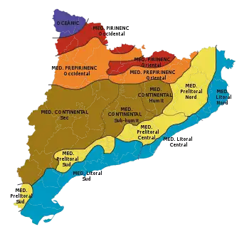 El clima de Cataluña es en general mediterráneo aunque, durante el invierno, hay una diferencia notable de temperaturas entre el litoral costero (clima propiamente mediterráneo), con temperaturas medias alrededor de los 10 °C y el interior (por debajo de los 1000 m de altitud) con temperaturas medianas invernales entre 3 y 7 °C. Las temperaturas de verano son más homogéneas alrededor de los 25 °C en la costa y entre 21 y 25 en el interior. El clima de montaña se caracteriza por una disminución de la temperatura y un incremento de las precipitaciones, todo esto de acuerdo con el aumento de la altitud. A partir de los 1500 metros se considera que empieza el clima de alta montaña. La temperatura mediana anual oscila entre los 17 °C del Delta del Ebro hasta los 0 °C, o inferior, a partir de los 3000 m de altitud. Las temperaturas extremas han sido de 43 °C en Lérida e Igualada en julio de 1982, Montblanch en 4 de julio de 1994, hasta -32 °C del lago Gento (en la cota de 2030 m) en febrero de 1956.[2] Las precipitaciones medianas anuales oscilan entre los 350 litros del Segriá y los 1200 de la alta Garrocha.[3]