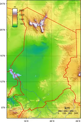 La topografía del país es generalmente plana, con la elevación en gradual aumento hacia norte y al este, partiendo desde el lago Chad. El punto más alto en el país es el monte Emi Koussi, un volcán que se eleva a 3445 msnm, ubicado al norte de las montañas Tibesti. La meseta de Ennedi y las tierras altas de Ouaddaï en el este completan la imagen de una cuenca ligeramente inclinada, que desciende lentamente hacia el lago Chad. También hay tierras altas en el centro del país, particularmente en la región de Guéra, que se alzan a 1.500 msnm.
