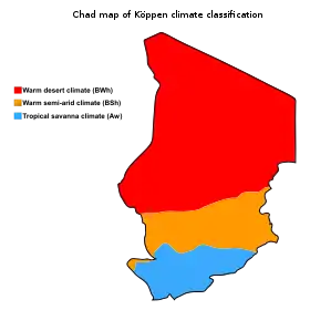 La geografía de Chad se caracteriza por la presencia de cuatro zonas bioclimáticas. La zona más septentrional, en el Sáhara, con un promedio inferior a 200 mm de precipitaciones al año, cuanta con bajas concentraciones de población humana, los cuales son en gran parte nómadas ganaderos, principalmente de pequeños rumiantes y camellos. La zona central, del Sahel, recibe entre 200 y 600 mm de precipitación anual y posee una vegetación ha que van desde la hierba, la estepa de arbustos espinosos, a la sabana abierta. La zona sur, denominada la zona sudanesa, recibe entre 600 y 1000 mm de lluvia, presenta bosques de sabana y bosques caducifolios. Por último, la zona suroeste en la zona de Guinea, se caracteriza por recibir precipitaciones que oscila entre 1000 y 1200 mm, que permite el crecimiento de una abundante vegetación.