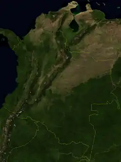 - Región Orinoquía: norte de la región oriental de Colombia, región plana de baja altitud. Puede verse o bien como la cuenca plana del Río Orinoco o como la región de Llanos Orientales de Colombia.