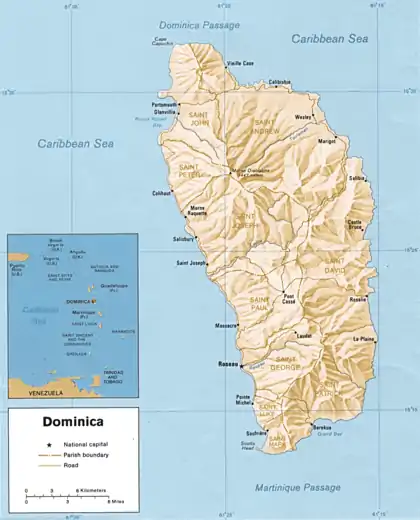 El punto más bajo del país se encuentra a nivel del mar a lo largo de la costa, y el punto más elevado es Morne Diablotins (1.447 m/4.747 pies). El extremo sudoccidental de la costa de la isla incluye una gran caldera submarina derrumbada. Porciones del borde expuesto de la caldera conforman el punto más elevado del sudoeste en Scotts Head. Los recursos naturales incluyen cultivos, energía hidráulica y recursos forestales.